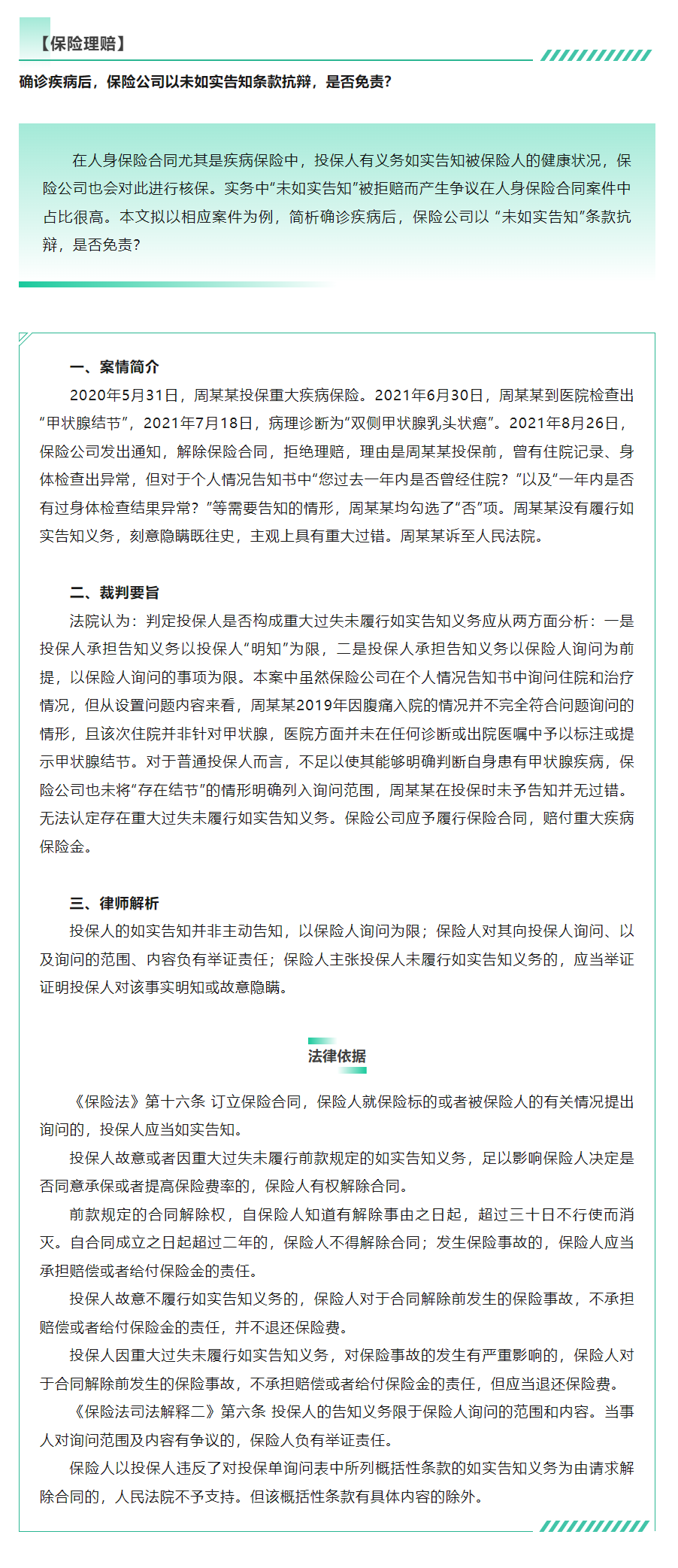保险理赔|确诊疾病后,保险公司以未如实告知条款抗辩,是否免责?