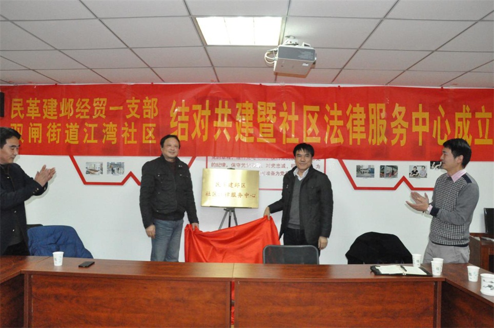 2015年12月25日,中国国民党革命委员会党员、江苏致邦律师事务所合伙人方怡、王海及王馨律师代表民革南京市建邺经贸一支部与建邺区双闸街道江湾社区结对共建社区法律服务中心。民革市委组织部处长张慰全、建邺区民革主委王利波、建邺区委统战部副部长张思根、江湾社区书记董文斌等负责人出席法律服务中心成立仪式并讲话。